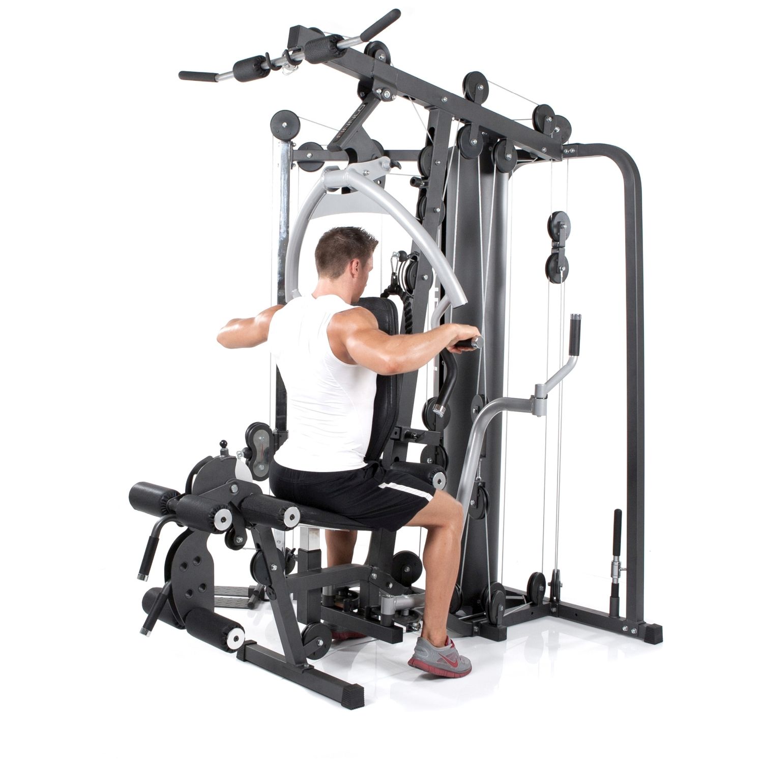 La torre de ejercicios multifuncional con calidad de estudio y turbo de fuerza para entrenamiento profesional de fitness y fuerza en casa. Incluye función extensora de piernas, unidad mariposa independiente y un sistema de rodillos giratorios de 160° y ajustables en altura para trabajar los músculos de forma eficiente.
