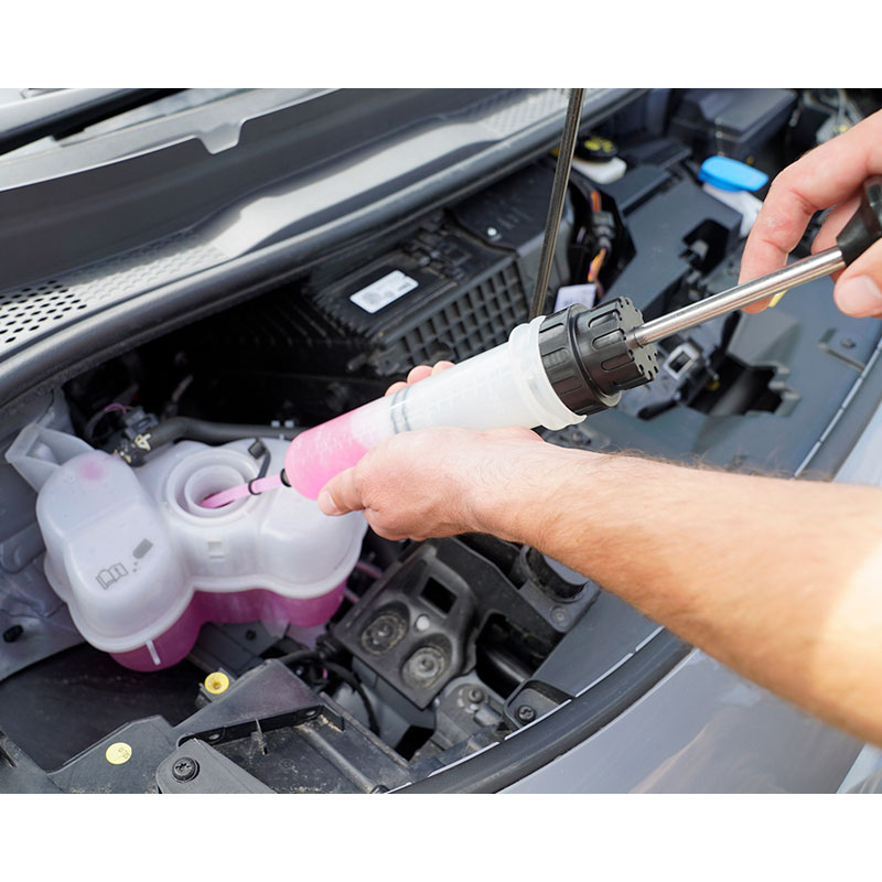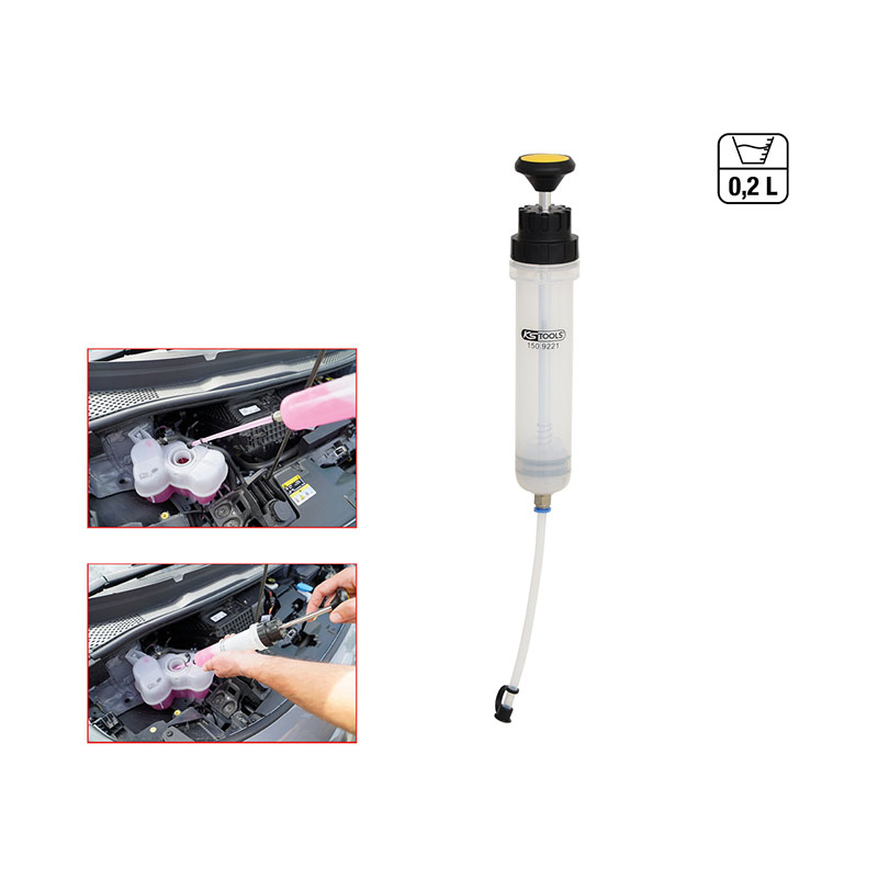 Propiedades generales: – Medio auxiliar ideal para trasvasar, aspirar o dosificar líquidos en cajas de cambios, direcciones asistidas, sistemas hidráulicos, motores, etc.; – Apto para líquido de frenos y agua; – Con dosificación fina; – El material sobrante se puede volver a aspirar sin problemas; – Incluye tubo de goma flexible con tapón de vaciado.