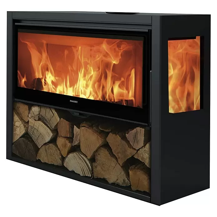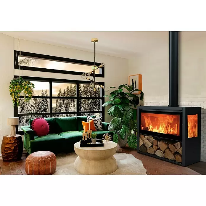 - Confort Térmico: El leñero y la capacidad para utilizar troncos de hasta 80 cm aseguran una carga fácil y una calefacción duradera y cómoda en espacios grandes.