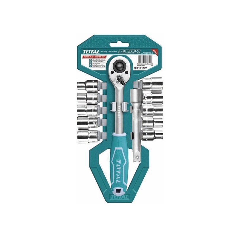 En concreto, este juego de la marca Total está fabricada de cromo vanadio o Cr-V, material muy resistente y duradero. Incluye 12 piezas diferenciando entre llaves de vaso y carraca de 1/2.