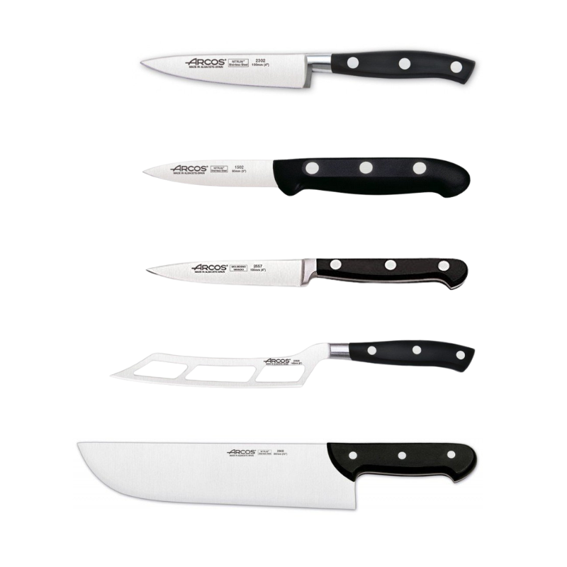 - Cuchillo Queso Arcos 232800 Serie Riviera: Diseñado para cortar diferentes tipos de quesos, desde blandos hasta duros, sin adherencia.