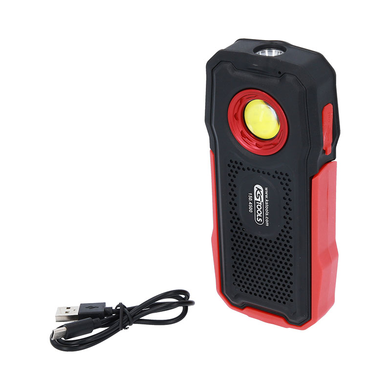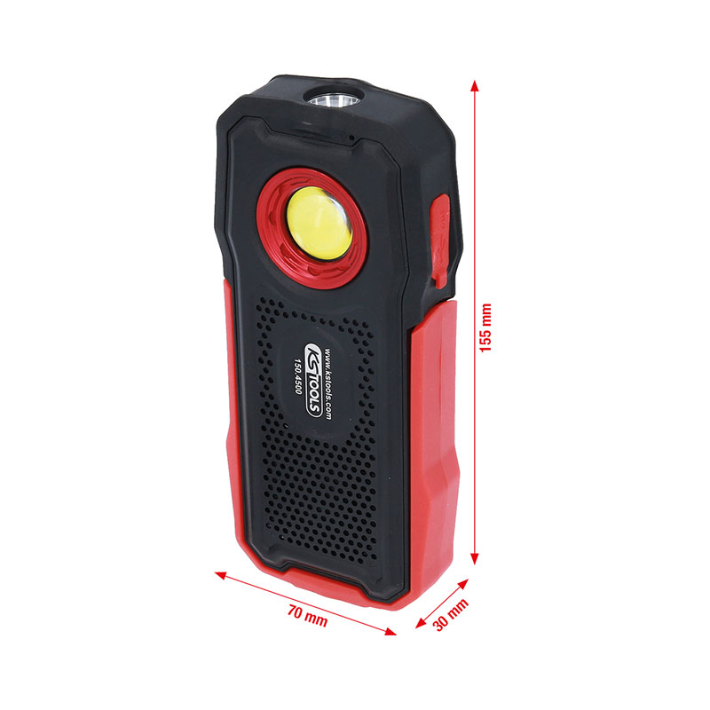 – Cuerpo de la carcasa recubierto de goma de alta calidad; – Ideal para trabajar independiente de la red eléctrica, – Linterna frontal LED COB de 1 x 5 vatios y 10 vatios; – Intensidad regulable de forma continua; – Con altavoces Bluetooth y micrófono.