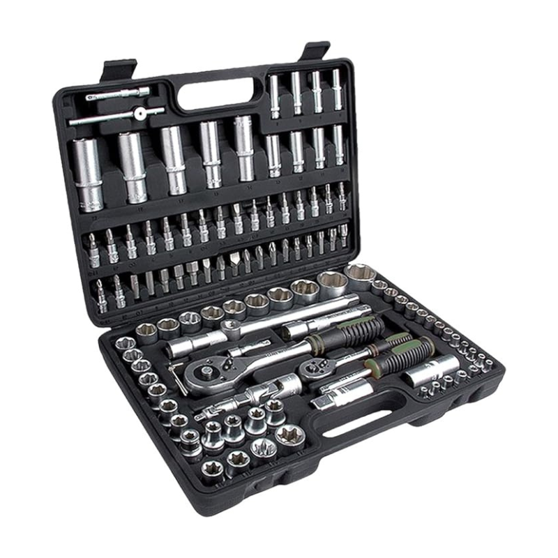 El conjunto incluye vasos cortos y largos, vasos con puntas de atornillado, llaves de carraca, alargadores, mangos corredizos y mucho más, todo cuidadosamente organizado para un acceso fácil y rápido. Con una combinación de piezas de 1/4” y 1/2”, esta maleta ofrece flexibilidad y rendimiento en cualquier situación.