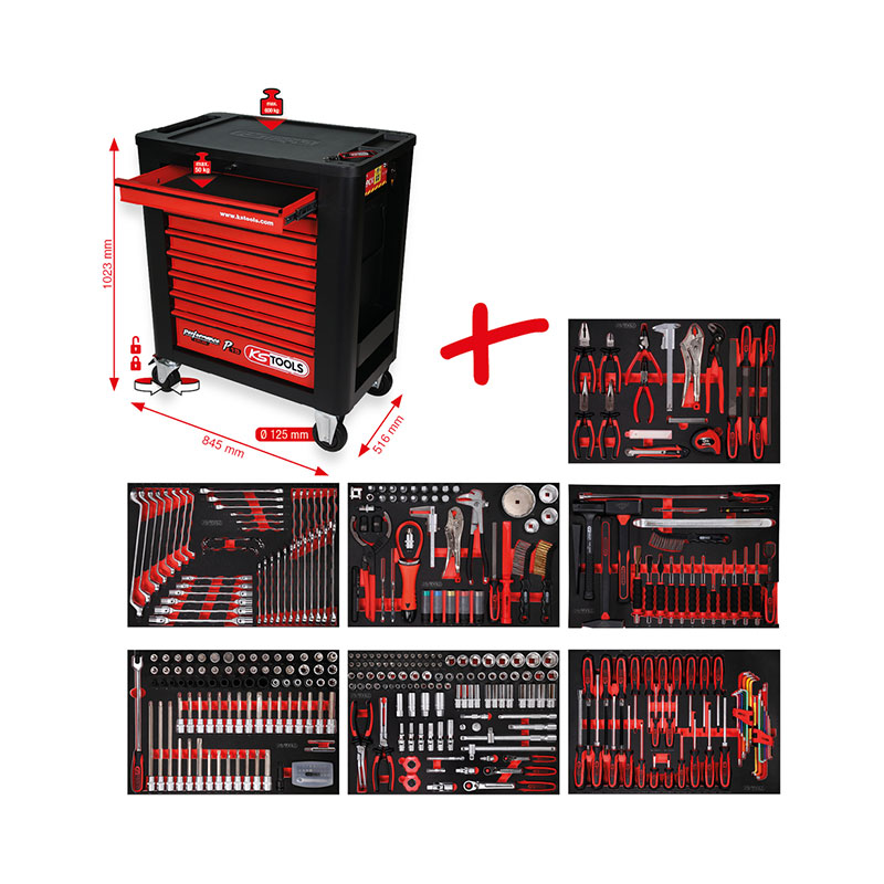 – 5x Llave de doble bisel, 8×9 – 10×11 – 12×13 – 14×15 – 16x17mm; – 19x Llave combinada, acodada, 6 – 7 – 8 – 9 – 10 – 11 – 12 – 13 – 14 – 15 – 16 – 17 – 18 – 19 – 20 – 21 – 22 – 23 – 24mm;