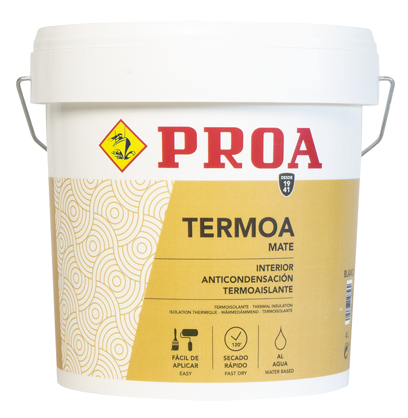 Pintura base acuosa formulada con polímeros acrílicos en suspensión acuosa que presenta propiedades termoaislantes y anticondensación debido a la incorporación en su formulación de microesferas de vidrió huecas en sustitución de otros pigmentos de carácter inorgánico. Especialmente indicada para uso interior de zonas con mucha condensación, como cocinas, baños y paredes que no dispongan de una cámara de aire en la pared contigua a las fachadas. También es adecuada para aquellas paredes a las que se les quiera aportar un aislamiento térmico. propriedades termoisolantes e anticondensação devido à introdução na sua formulação de microesferas de vidro ocas em substituição doutros pigmentos inorgânicos. Especialmente recomendada para uso interior de locais com muita condensação como cozinhas, casas de banho e paredes que não tenham câmara de ar separando a fachada. Também é apropriada para as paredes que precisem isolamento térmico.